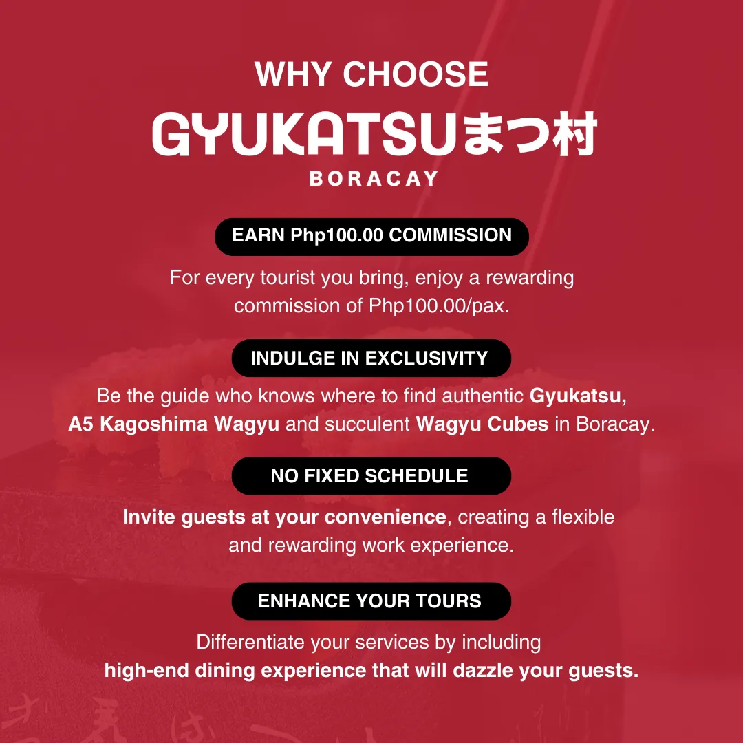 Partner with Gyukatsu まつ村 Boracay, the island’s premier dining destination, and treat your guests to an exclusive taste of Japan with our authentic Gyukatsu, A5 Kagoshima Wagyu, and mouthwatering Wagyu Cubes. Whether you're a Local Tourist Guide, Airbnb Host, or Tour Agency, we’re here to offer the latest MUST-TRY dining experience in Boracay!